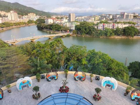 五指山鹏来酒店:五指山有得天独厚的优质空气,离三亚的阳光和沙滩也非常近,是一个理想的养生休闲宝地。来自杭州的两位大学老师投资创办了这家酒店,致力于创办成一家独具特色、友好整洁、休闲优美的酒店;酒店坐落在五指山市中心,坐在酒店四楼平台上,可享受美食、饮品,与朋友交流谈心,穿过市中心的南圣河在旁边静静流畅,整个五指山的夜色美景尽收眼底…