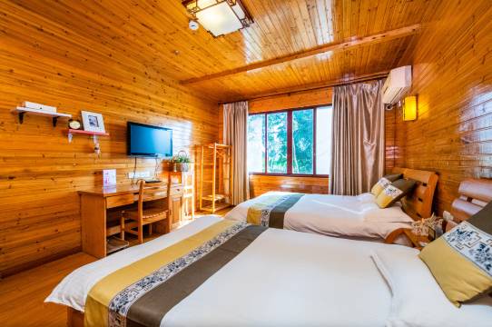 独幢单层全木屋别墅,建筑面积115平方米,拥有全新标准间、家庭房。木屋家具全部为新西兰松木原木家具,生态环保,做工细腻,富有现代生活感。同时配备豪华休闲棋牌室,观景休闲长廊。农家乐配备4M无线宽带、空调、彩电、独立卫生间、热水淋浴,热水系统采用先进的空气热能循环加热系统与太阳能相结合,确保宾客24小时用水,为您提供双重保障。