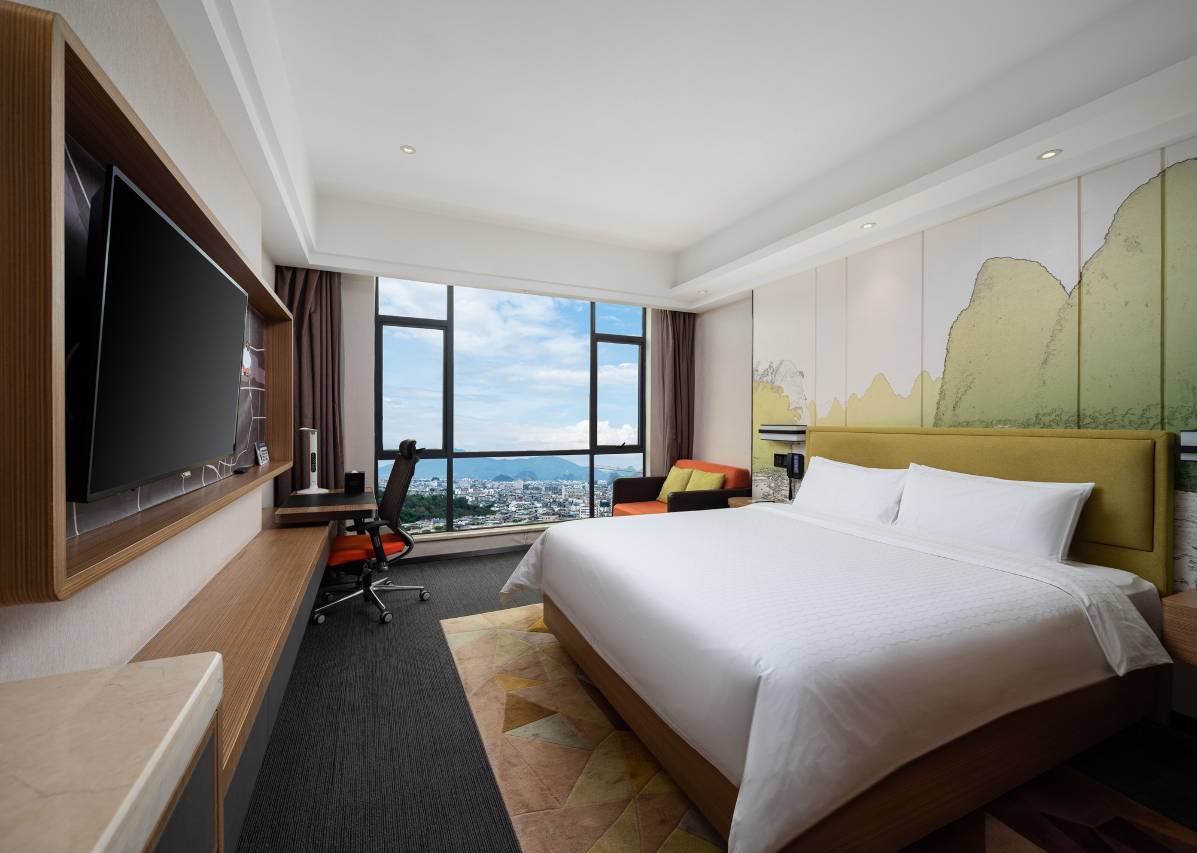 酒店拥有现代设计风格客房,广阔视野坐拥桂林城市景观,推窗远眺即见桂林山水“峰环野立,一水抱城流”的美景。酒店拥有美国“Hampton Bed”标准Serta双专利床垫,另配生态认证的床上用品,打造云端甜梦体验,第二天醒来时精神振奋。房内配备宽大的书桌和可调节的人体工学座椅,洗漱用品采用的是美国医学护肤领域的殿堂级品牌Peter Thomas Roth(彼得罗夫)品牌;大床房间配备只需两步轻松翻转,即可将一张休闲沙发立马变身舒适的1.5m亲子沙发床,同时国际一线品牌Kohler 的卫浴设备,为你带来舒心的沐浴体验。