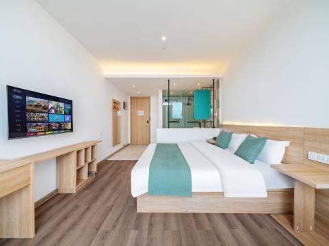 房间特别干净 而且前台服务好 离海边还进 还有一个大泳池 淘气堡 都是可以随便玩的 适合带小朋友来 而且非常评价 家人们 冲冲冲