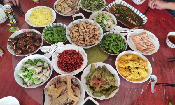 房间很大,我们一家人4大一小订了两间房,阿姨给我们安排在一起,阳台开了能通过,很方便,我们吃了晚饭,饭菜不错,早饭也很丰富,临走时还给我们带走了一大包自家种的蔬菜,这次行程很开心!