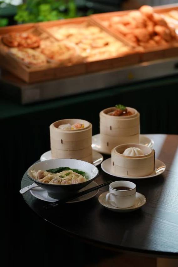 自助餐很丰富,还有现做的肠粉,楼下是步行街其实也很多吃的,送餐用小机器人还蛮可爱