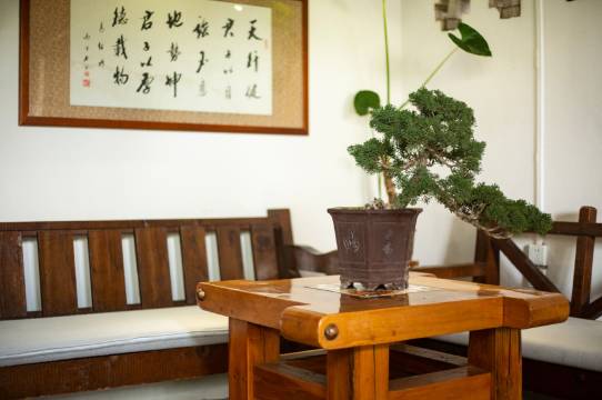 客栈门前小河淌水,屋后梵音绕梁。房屋建筑古色古香,院落宽敞明亮。随处可见的名家书法作品赏心悦目,让人流连驻足。