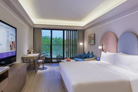客房是通往自然的观景台。推开门,42平米起的空间宽敞而明亮,圆弧形的软装中和了硬朗的线条,处处透着法式的浪漫与典雅。最令人心动的,是那扇巨大的落地窗和私属阳台。躺在床上,满目皆是苍翠的绿意;站在阳台上,仿佛伸手就能触碰到树梢的呼吸。无论是春日的嫩绿,还是深秋那一抹醉人的焦糖红,窗外的风景如同一幅流动的油画,让你足不出户便能独享四季的更迭。