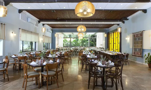 酒店庭院宽敞,绿树成荫,鲜花盛开。您可以悠闲漫步,躺在吊床上,或在壁炉旁休憩。酒店还设有凉亭。