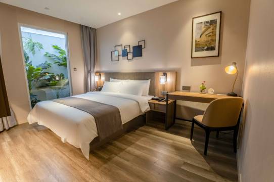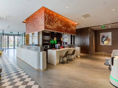 酒店步行5分钟可达地铁站,周边是商业街,各种外卖齐全。前台员工热情专业,快速办理入住。大堂休闲区适合临时等待,同时送餐机器人送物服务科技感十足。会员折扣+提前预订优惠力度大。