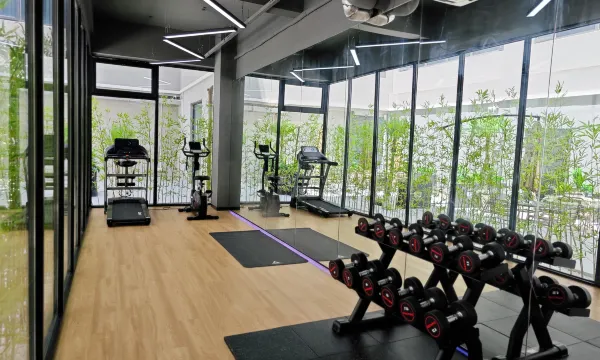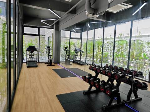 健身房藏在餐厅玻璃门的后面,但因为当时关着门而且是非透明玻璃,店内也没有清晰的指示,健身区略小但是够用。挨着一小片户外区域,天气暖的时候很适合喝咖啡。