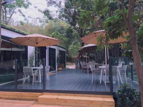 设施:房间门口有桌椅还有遮阳伞,房间里面有沙发,感觉很温馨。