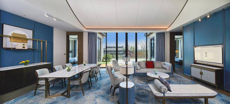 酒店拥有多间雅致静谧的中式院墅套房,104-174平方米大空间,私享独院花园。白墙黛瓦的设计,质朴而别致的坡顶结构,精心糅合的篆刻、榫卯结构、陶艺、书画等本地文化元素在一动一静间淋漓展现。居停于此,奢享东方雅韵,邂逅泉城时光。