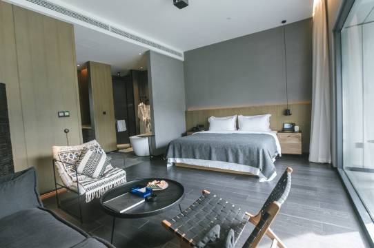 酒店客房带露台院子。“融入自然与历史,在喧市之中寻一方净土”,灰色、纯净的室内空间再配上点点的原木元素营造出一种“静谧”的空间感。