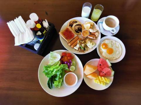 我住在一个别墅区的淋浴式住宿。房间两面有窗户,入口是玻璃的,非常适合欣赏花园景色。四天的早餐每天都有变化,泰式和欧式交替,还提供新鲜水果,有西瓜、菠萝和芒果。早餐时遇到的大部分人看起来都是欧洲游客。悬崖边的餐厅和游泳池给我留下了特别深刻的印象。