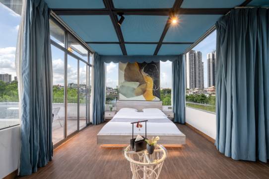 装修气氛挺好的,很好看。房间很大,卫生也很干净,大堂有两棵树很特别,开车进来直接停酒店门口,跑去旁边整两杯回来睡觉,服务态度很热情,值得打卡,本身预订那个楼顶那个玻璃房比较难约,下次体验下。