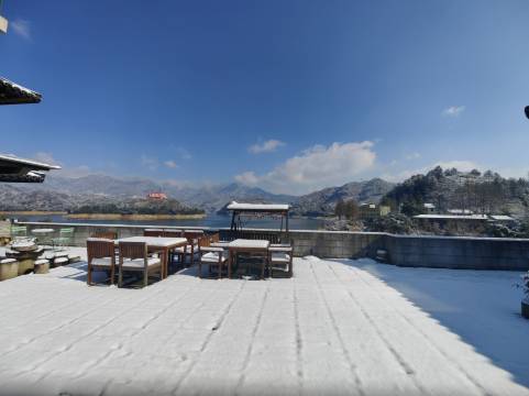 推开古色古香中式大门走入院子平台,犹如一大幅自然山水画涌入眼帘。远山近水,湖光山色,美不胜收。仔细端详,最特别的还是,眼前的山水犹如一尊卧佛头枕碧波安详自然,好像在祈福保佑着能随缘看见他的人。