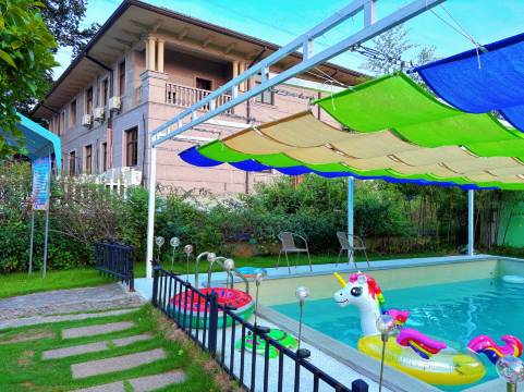 民宿配有24小时热水,室外泳池,假山凉亭,桌球,K歌,棋牌,乒乓球,儿童蹦床,翘翘板等。