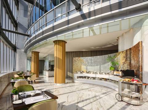 清晨靠窗吃早餐看云海翻腾,入夜透过270度落地窗俯瞰灯火辉煌的陆家嘴环路和外滩,景观被公认是“陆家嘴天花板”