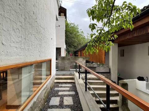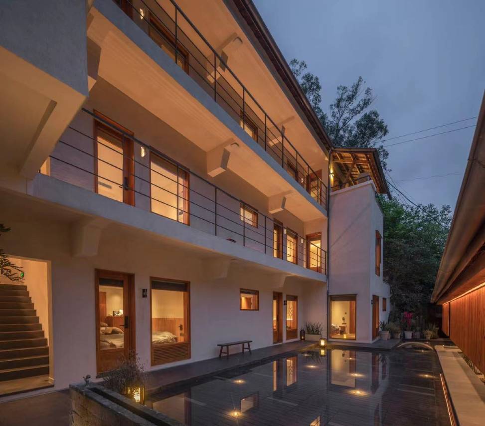 “清溪清我心,水色异诸水”。保留原学校之名“元门”,加上使人心境清澈的清清溪流,故将民宿取名“元门清溪”。“元门清溪民宿”位于重庆市北碚区金刀峡山下竹溪河边、偏岩古镇上游3公里处,海拔200多米,由巴黎建筑学院建筑专业硕士、国家高级建筑师谢凯团队倾力设计打造。民宿以旧学校建筑改新,由北楼、西楼、南楼构建而成,中间有庭院相隔。十二间大小不一的客房配有轻奢品牌的床垫和卫浴以及洗漱用品,客房、餐厅、书吧茶饮、会议室装有地暖空调。设有多个不同建筑风格、功能各异的公共空间,用以观星揽月、吹风听雨、聚会聊天、活动玩乐等等。感谢大自然的恩赐,民宿北有靠山,其余三面有五颗近300岁的老黄角树环护着,盘根交杂与民宿形成无法分隔的一体。东头有一座长满苔藓的石拱桥连接着这山和那山,门前清清的溪水合着“嘎嘎嘎”鸭子的声音自西向东,经桥下蜿蜒流淌而过。在石桥和老树的庇荫处,有一座保佑村民的庙窟,香火很旺,真是一处洞天福地啊!民宿还拥有自己的农田、菜园和花果园,这里也是各种小动物的家。民宿的创始人本着人文、尊重历史、保护原生态的理念,花三年时间精心打造出“外原内奢”的“元门清溪民宿”,这里适合一个人,也适合一群人。这里有一条永恒的溪流,有一片永续的农田,有玫瑰也有稻花香,有野菜也有家蔬......就算没有任何通讯和科技产品,在这里我们依然能够生活下去。