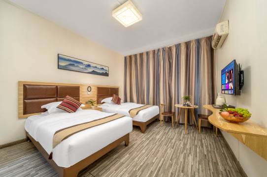 是民宿套间,三床,安静,卫生,有楼顶晾衣服,洗衣机脱水,暑假携程网预订住宿费160元性价比很高。在西街附近,步行很近,这里一条街都是旅社 饭店,很方便,旁边头点餐馆米粉等实惠量足,谢三姐啤酒鱼用**很实惠,味道好。老板娘免费借自己的电动车给我去十里画廊遇龙河,介绍景点很热情