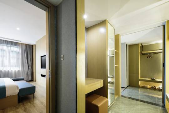 房间干净又整洁,床又大又软,晚上我直接一觉到天亮。卫生间也打扫得很到位,洗漱用品质量很好。房间的隔音效果可以,设备设施也比较完善。周边耍的吃的也多,挨着政府。出差人首选