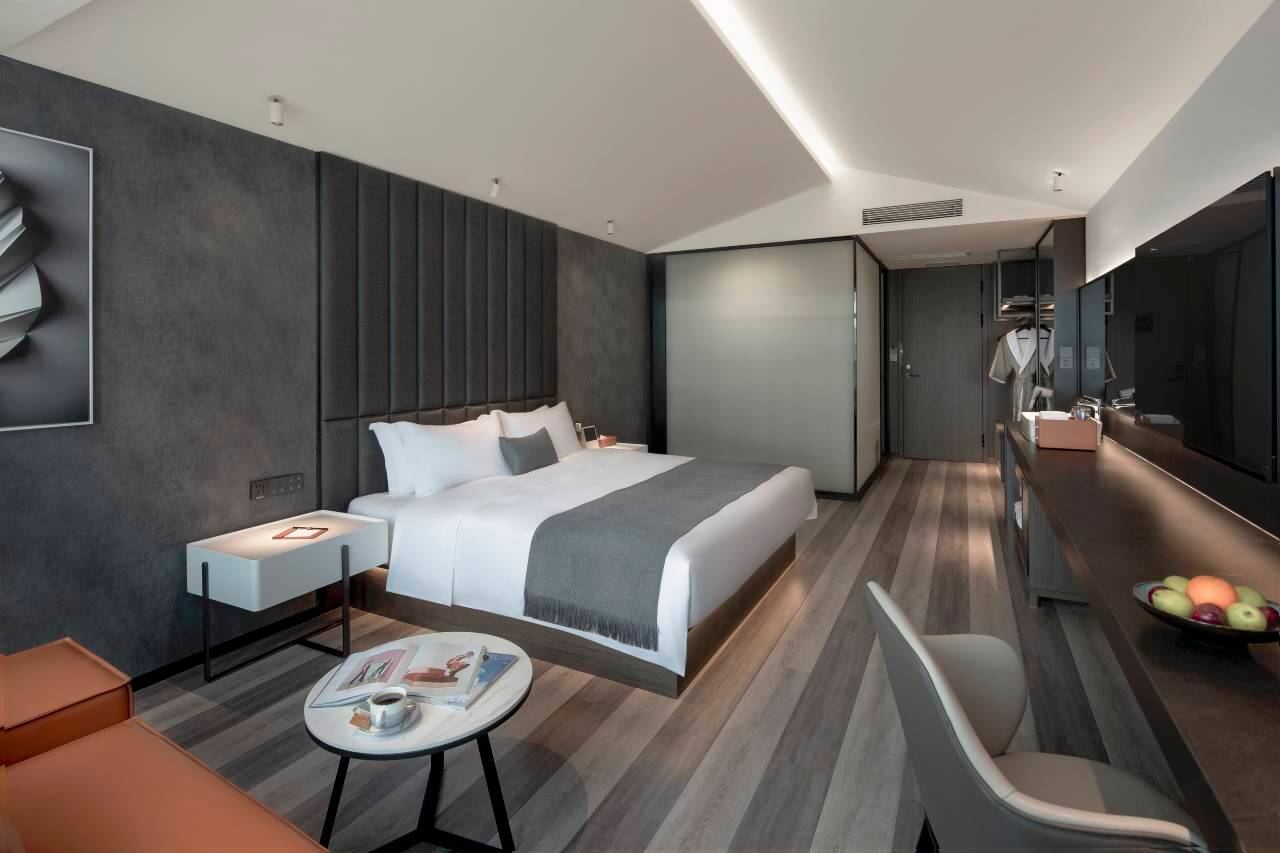 这次住的是他家的高级大床房,房间很大,有一个超长的岛台显得很宽阔,各种设施之间距离很宽,完全不显得拥挤,卫生间干湿分离,不像很多酒店只是有个帘子挡着。隔音措施也很好,住临路房间关上窗户完全不吵。房间内还有智能助手小度,它可以帮忙关窗帘和关灯,真的是太方便了!