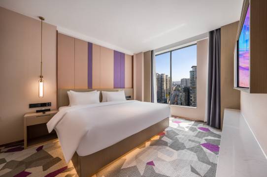 这个酒店性价比非常高 刚开始订的房型楼层我觉得有点低 前台小姐姐免费给我升级了行政大床 (ps:前台小姐姐长得真好看)干净整洁 电动窗帘 价格一百多还带有早餐 房间的拖鞋是消毒单独包装的 厕所干湿分离!感觉很不错 对面就是万达 地铁