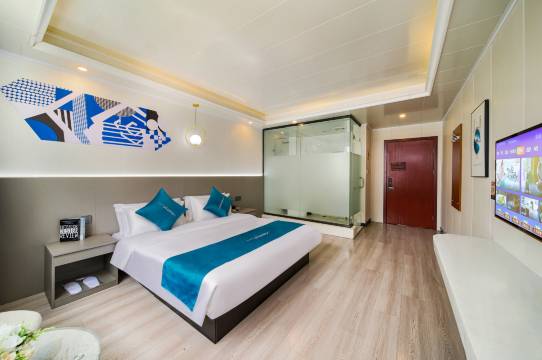环境好,卫生干净,价格亲民,前台服务好,设备齐全,朝南房间采光很好,停车方便,赠送矿泉水,交通便利,繁华地带,晚上还有小吃街,洗漱用品配备很足,就连毛巾用的都是一次性的,很干净,空调效果很好,体验感很不错,去电影小镇,临时休息订的房间,很不错的,推荐赞赞赞赞赞!!