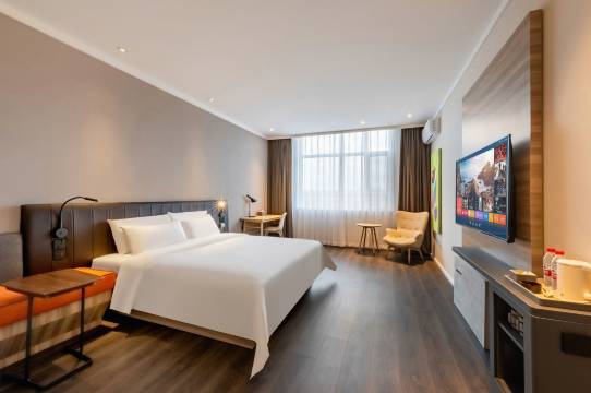 孩子点名要住的酒店,之前住过一次其他城市的汉庭感觉非常好!这次也特别满意!房间特别宽敞,桌子就有3种大小不同类型,两把皮质椅子坐着都很舒服。床边还有可以可坐可躺的设施。干湿分离,洗手台简洁干净,旁边的穿衣镜和换鞋座椅很贴心。淋浴间和马桶中间有玻璃隔门很舒心。吹风机好用。最优势的地方就是大玻璃窗户正对着城墙,晚上灯亮后景色很壮观!躺在床上就可以欣赏夜景。床品品质一如既往的好,软硬双枕睡着舒服。酒店单独一栋楼,楼前就是停车场,停车方便。对面就可以登上城墙。附近大小饭店很多,向北走5分钟就是一条古街,穿过古街就到了隆兴寺。一路观景,一路美食,一路打卡。计划以后带着老人来还住在这里。