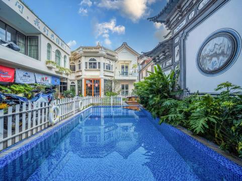 咱家是机车主题客栈,欧式风格,院子里有花园泳池,三楼大阳台可以喝下午茶,烧烤party。