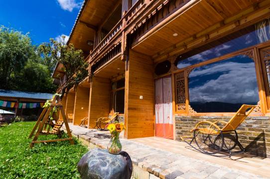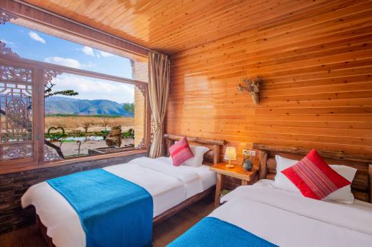 每个房间都能看到泸沽湖的山景,在草海边上摩梭风情的房子都是山上的树木拼叠而成,透着古朴和典雅,给您视觉的民族体验。并且木质建筑有冬暖夏凉的感觉