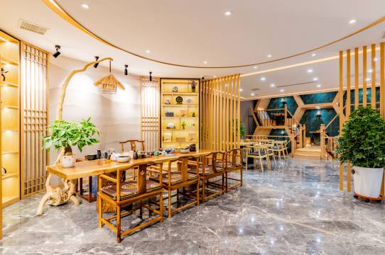 房间和公共区域都带着淡雅的新中式风格,洗漱台的山水背景、大堂的水墨装饰,看着特别舒服,氛围安静又高级。