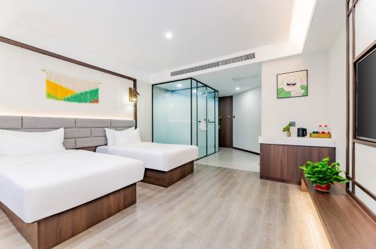 客房设施很实用:双床、独立卫浴(带智能马桶)、洗漱台设计精致,还有书桌和茶歇区,日常住的舒适度够够的。