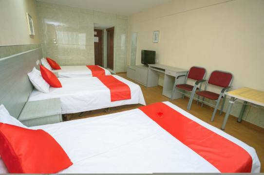 旅馆装修风格简约大方,房间内的布置朴素温馨,物品摆放布局合理,白色床铺看上去干净又柔软,深色的窗帘可以很好地遮住屋外的光线,保证顾客的睡眠质量。有多种房型供顾客选择,分体空调、一次性洗漱用品等基础设备都很齐全;优美的环境,再搭配上细致周到的服务,定能满足您的品质需求!