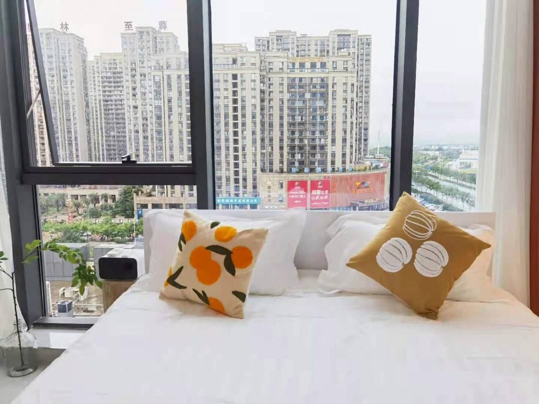 房间宽敞整洁,落地窗俯瞰外面的街道很美