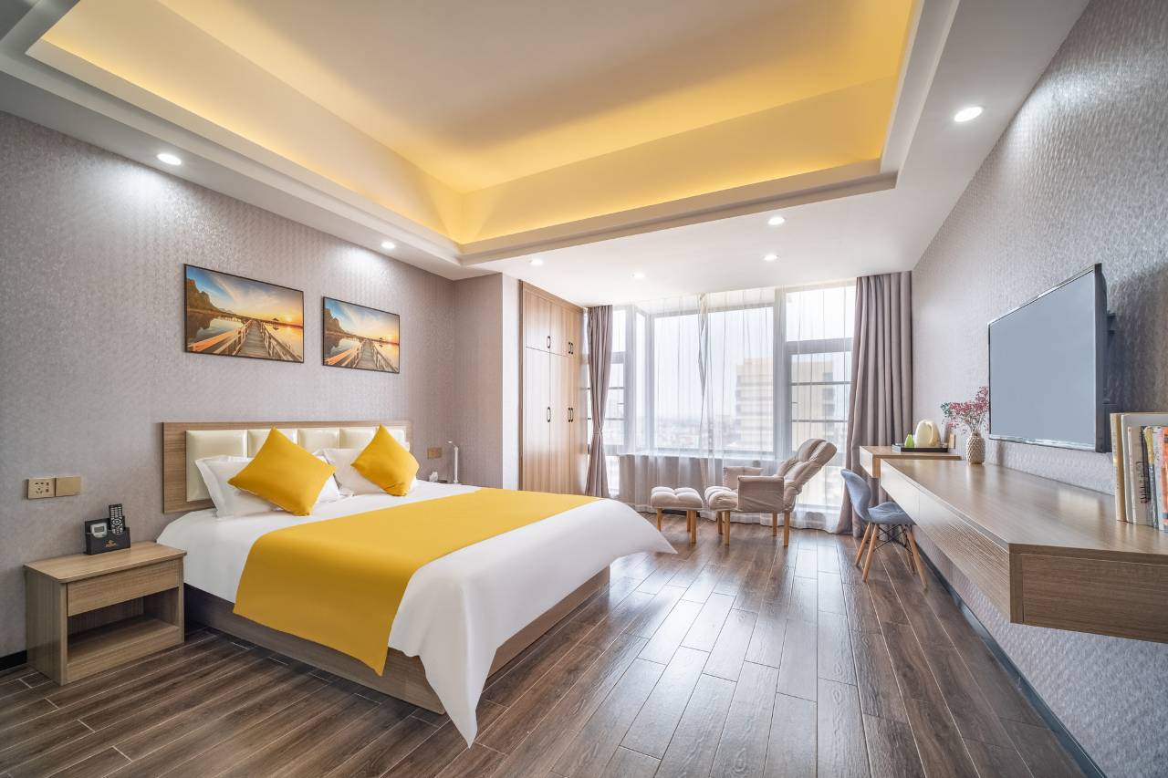 房间宽敞明亮,床铺很大,厕浴分离,备有一次性浴巾,有洗衣机,冰箱,桌子也多,椅子也多,卫生好,服务好