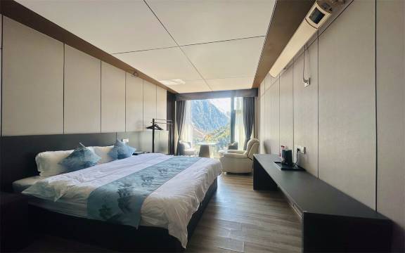 这么冷的天有烘衣机 地暖 关键是床真是舒服 真的干净 唯一缺点啊 有体力到酒店 风景属于最高点了 拉开窗户就是雪山 奈何我去的时候阴天下雪了