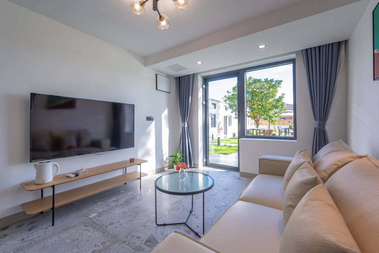 真的给这个民宿点赞👍,我们住的房间是带浴缸的,巨大的落地窗将窗外的绿意框成了一幅画。床品干爽舒适,卫浴设施是现代化的,水压和水温都很稳定。值得一提的是,房间打扫得非常干净,光脚踩在地板上也没有灰尘。一些小细节很加分,比如质量很好的洗漱用品、卫生纸都是品牌的、草坪上一张舒适的躺椅看落日真的超级爽!