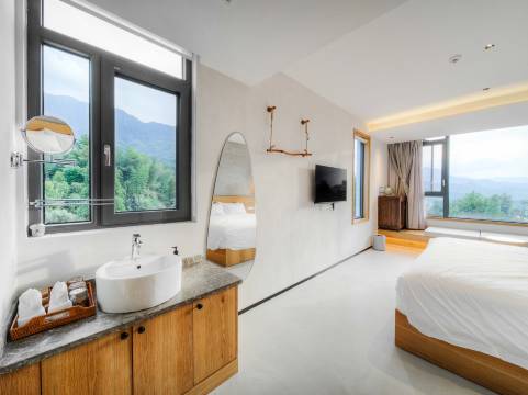 从亲子房的大玻璃窗能看到很美的山景、云景。民宿各方面都考虑得很周到,事事有商有量,住在那里很省心。