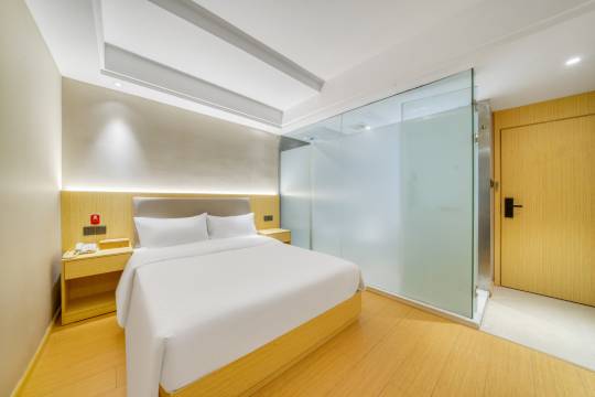 出差定的两间大床房。房间简洁干净、前台服务热情周到!离地铁站步行五分钟,楼下各种小吃店、便利店林立。非常舒心的入住体验!全五星好评!
