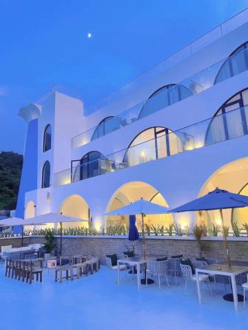 这儿简直就是把希腊的圣托里尼搬到了南澳岛!整个民宿是纯净的蓝白配色,配上标志性的弧形设计,度假感拉满。