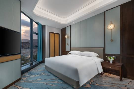 岱山最好的五星级酒店了吧。房间非常豪华,层高很高,走进去就很舒服。床品特别好,厕所也很干净。我们的是海景房,大落地玻璃窗能看到海和灯塔博物馆。晚上五点半到八点半自助餐开餐。自助餐有烤鸭,三文鱼。蒸汽生蚝,蛤蜊。其他菜品娃还是很开心的。还给娃送了小玩具。娃很开心。停车地下车库。