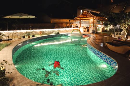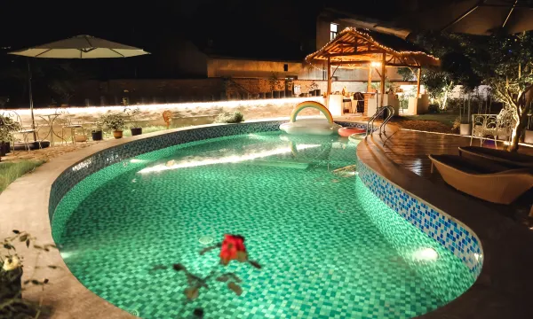 白天:可以在花园里欣赏各种各样花草,可以在帐篷下聊天拍照,也可以在“腰果”形泳池里嬉戏游泳,玩累了也可以来隐藏在地下室里的咖啡馆里小喝一杯咖啡,听听音乐,拍拍照,也可以和朋友在咖啡馆里的一个小型私人影院看电影。