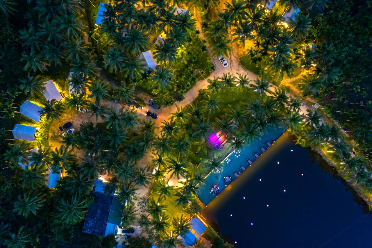 航拍下来一座座独立的帐篷藏在椰林之中日出日落拍照都非常绝美