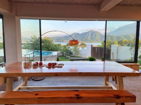 民宿坐落半山腰,却是三江口晚霞的最佳好望角,即使躺在床上江上的船来鸟往都能一览无余。房间宽敞而且收拾得一层不染,一拐一角的设计、摆放都很原木、很到位。院子里朝着晚霞的方向有一个蓝得很彻底的游泳池,守着每晚火红火红的霞光满天。