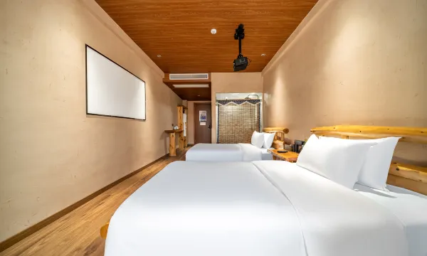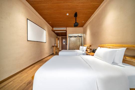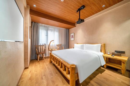 酒店客房面积20-40平方米,房间内部设施齐全,带有空调、24小时热水,每种房型均为香樟实木的定制家具,房内配备智能化语音声控系统、可通过语音控制房内电器开关;还配备了高清投影电视、智能马桶、地暖、茶台等;酒店客房设有浴缸房、麻将房、大床双床等多个房型,满足您的所有需求;分开单独进出门的设计方便公司团建包栋包层使用价格更优;民宿楼下的公共休闲区配套酒吧、投影仪、KTV等娱乐设施,不论是聚会、闲聊或是桌游,都可以满足客人的需求。酒店一楼有宋韵茶室,鸯楼、狮子楼这两个豪华中餐包厢,一个集休闲、餐饮、会务于一体的多功能厅——快活林,可同时容纳200余人用餐,是家庭聚会、团队等理想的会议宴会场所。让你的旅居生活更悠闲自在。为了住店客官能够出行方便,酒店贴心配备了洗衣房,位于五楼,客房电梯直达,还能饱览城楼、古街、双塔、三江美景。