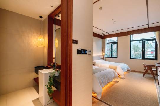 房间大.智能.干湿分区.性价比高.附近吃饭的地方还挺多的.对着河边.中间有个中庭.适合路过休息.总体满意.