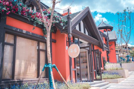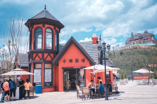 网红小镇上有网红桥,餐厅,食堂、甜品店,理发店、音乐餐厅,咖啡馆,书店,花房,个性小店等,整个街区是以红色为主色调的欧式建筑,来到这里,就像走进了异国他乡的童话世界。