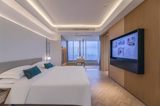 酒店风格时尚年轻温馨,大堂拥有9.3m的超高书墙,更收藏上千册经典书籍,自带网红打卡气质;酒店slogan:安适如常,朝观夕览,很好的诠释了宁波港通天下,书藏古今的城市文化底蕴,是一家文艺范的高空酒店。