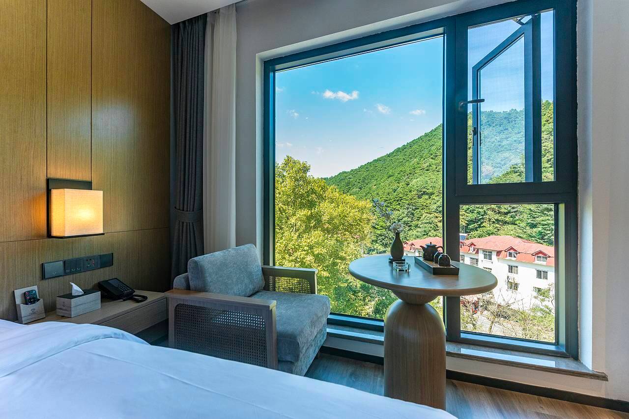 设施配置更是远超预期,作为2021年按准五星标准打造的酒店,细节处满是贴心。大堂和部分客房带地暖,搭配动力十足的中央空调,即便山间微凉也能暖意融融。房间是原木轻奢风,宽敞明亮,超大落地窗堪称点睛之笔,推窗就能望见苍松翠柏的山景,清晨还能看到云雾漫过别墅群的绝美画面,宛如仙境[__LINK_ICON]。亲子家庭选亲子房再合适不过,自带滑梯和全屋智能家居,孩子玩得不亦乐乎。公区更是丰富,茶吧、书吧适合惬意休憩,健身房、棋牌室能打发闲暇时光,顶楼270°露台更是观云海的绝佳位置,傍晚在这里看落日超治愈。