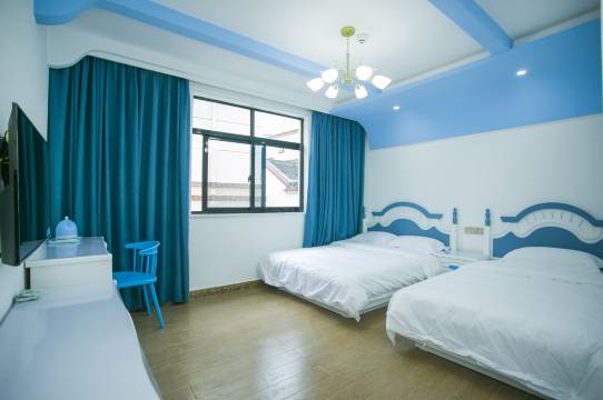 民宿隐匿于碧海蓝天环绕的嵊泗县五龙乡田岙村东厂弄12号,得天独厚的地理位置,让它成为游客度假休憩的理想之所。民宿与大悲山、铃音禅寺仅一公里之遥,晨钟暮鼓间,沾染几分禅意;不远处的渔村码头,渔船往来,尽是鲜活的海岛生活气息。民宿精心装修,特色客房各具魅力,将现代舒适与海岛风情完美融合。房间类型丰富多样,无论是与家人出行,还是情侣结伴,都能找到心仪之选。简约家庭房以原木色为主调,搭配棉麻质感的家居,温馨舒适;海洋系家庭房将深蓝与浅蓝交织,海浪、贝壳等装饰元素点缀其间,充满梦幻色彩;蓝色调家庭房以纯净的蓝色为基底,搭配白色软装,带来扑面而来的清爽之感;可爱柠檬黄家庭房用明亮的色调搭配,活泼俏皮;清新家庭房则以淡雅的莫兰迪色系营造出宁静氛围。大床房虽面积小巧,但部分带有阳台、露台,可将渔村风光与辽阔海景尽收眼底。每间客房都配备了空调、暖气、液晶电视等现代化设施,智能门锁、增添科技感,24小时热水、吹风机、洗漱用品等细节之处尽显贴心。民宿的公共区域同样别具匠心,庭院内摆放着古朴的藤编桌椅,四周种满了三角梅与多肉植物,午后坐在庭院中,看阳光在花叶间跳跃,惬意悠然。顶楼设有观海露台,傍晚时分,在此支起烧烤架,与家人朋友一同享受海鲜烧烤,看夕阳将海面染成金色,夜幕降临后,还能伴着星辰大海谈天说地。在这里,热情好客的房东是一大亮点。他们不仅会热心帮忙解决各种问题,还会分享当地的游玩攻略,带你探索无人知晓的小众海滩、赶海圣地。此外,民宿还不定期组织出海捕鱼、制作海岛渔民画等特色活动,让你深度体验海岛生活的乐趣。无论是清晨被海风唤醒,还是夜晚伴着涛声入眠,民宿都将为你带来一段难忘的海岛度假时光。