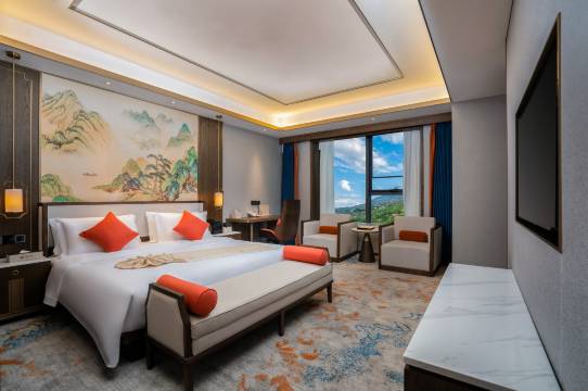 酒店营业面积12000平方米,建筑设计独具匠心,将艺术元素渗透到每个细节的设计当中。酒店按照星级客房设计装修,拥有各类高档全智能客房多间,拥有大型专用停车场、多功能会议室、特色茶文化,精致咖啡吧、健身房等于一体,让您享受到无微不至的呵护。