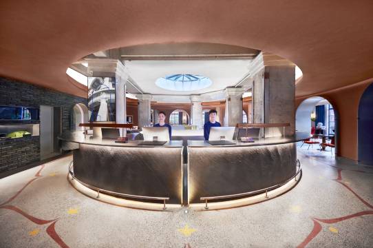 酒店是古典建筑 、现代智能、个性娱乐的结合体,有优雅的旋转楼梯,复古的老式电梯,可直达2楼前台,前台安装自助入住机,10-30秒快速办理入住,零售专区提供专为Z世代设计的原创产品。